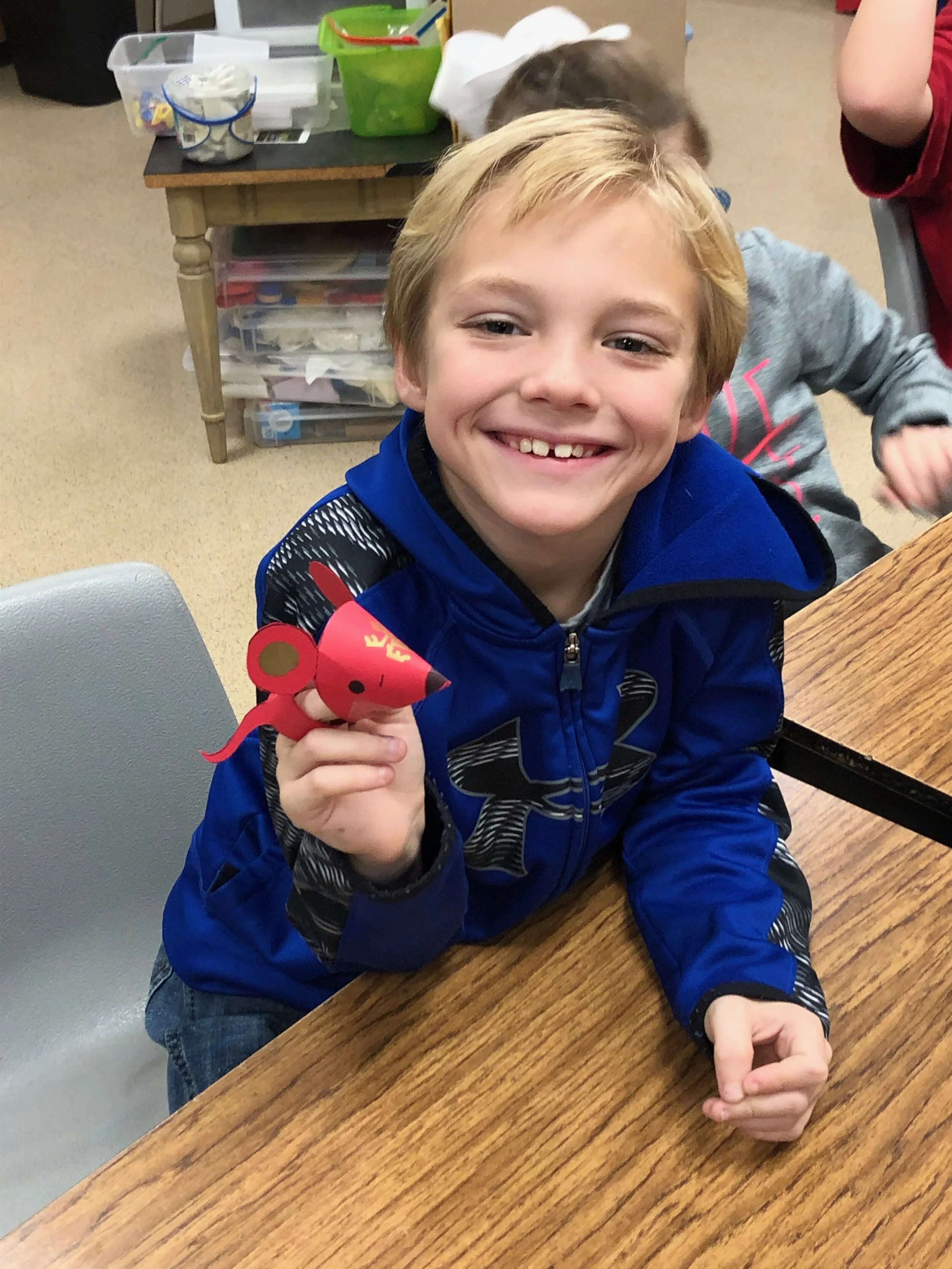 Younger elementary students crafted Rat-shaped finger puppets and practiced their calligraphy skills by decorating their puppet with the Mandarin word for Rat.