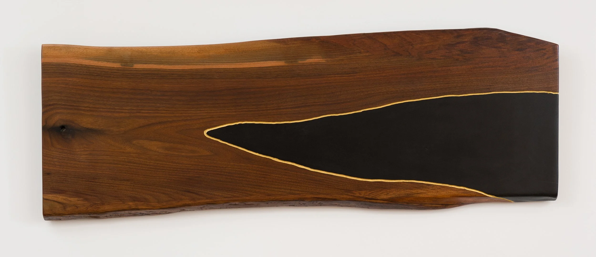 JEFFREY BROSK, Montrose Tale, 2015, walnut, stain, gold leaf, 23 x 65 x 1.5 in. Courtesy of the artist.